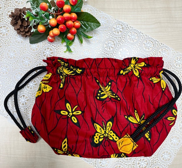 【商品紹介】 ジャパニーズテイストの巾着袋をアフリカンバティックで作りました。和の雰囲気を損なわず、アフリカンバティックの柄がスタイリッシュさに磨きをかけます。 同じ生地を使用した巾着袋調整用のヒモ先端が、良いアクセントになっています。隅から隅まで極上の愛嬌を詰め込んだ、スペシャルな1枚です。 また、落ち着いたブラウンカラーの裏地のおかげで、おしゃれ度アップだけではなく、丈夫に仕上がりました。 末永く使っていただける、使い勝手の良い巾着袋はいかがでしょうか。 【寸法】本体:高さ20×横幅34cm(平置き計測) 底面:縦20×横20cm 【素材】本体:綿 裏地:ポリエステル 【特徴】巾着ヒモ付き 【その他】 ・色落ちするため、単独での洗濯を推奨いたします。 (洗濯を繰り返していると、色落ちはなくなります。) ・染色した生地ならではの、クラックなどが見られる場合がございます。 ・アフリカンバティックの性質上、同じ生地であって風合いのや染め具合の違いがあります。 また、総柄のため裁断している場所により、写真と異なる生地の取り方になる場合がございます。 ・お使いの端末やブラウザなどにより、多少の色の違いを感じる場合がございます。