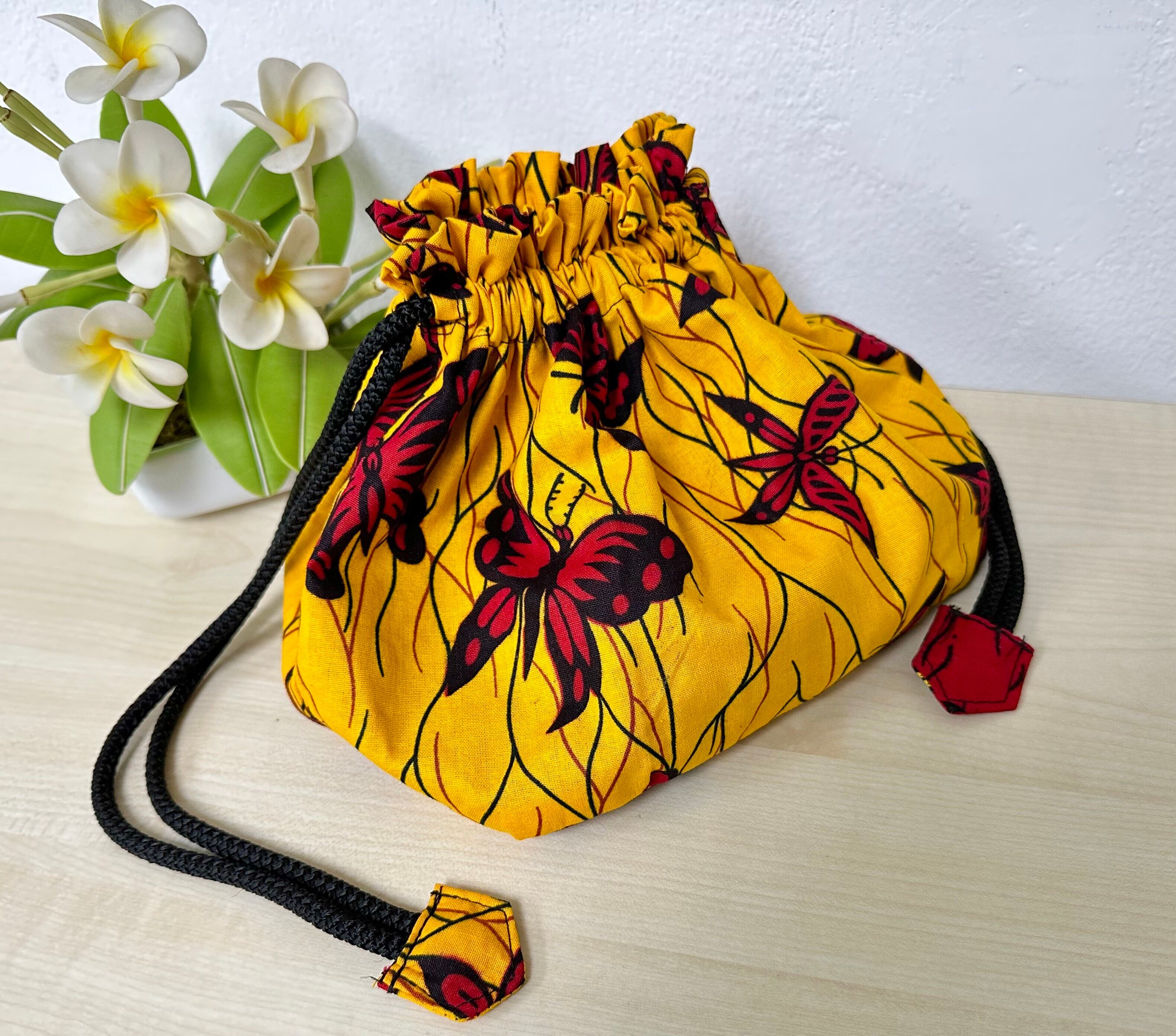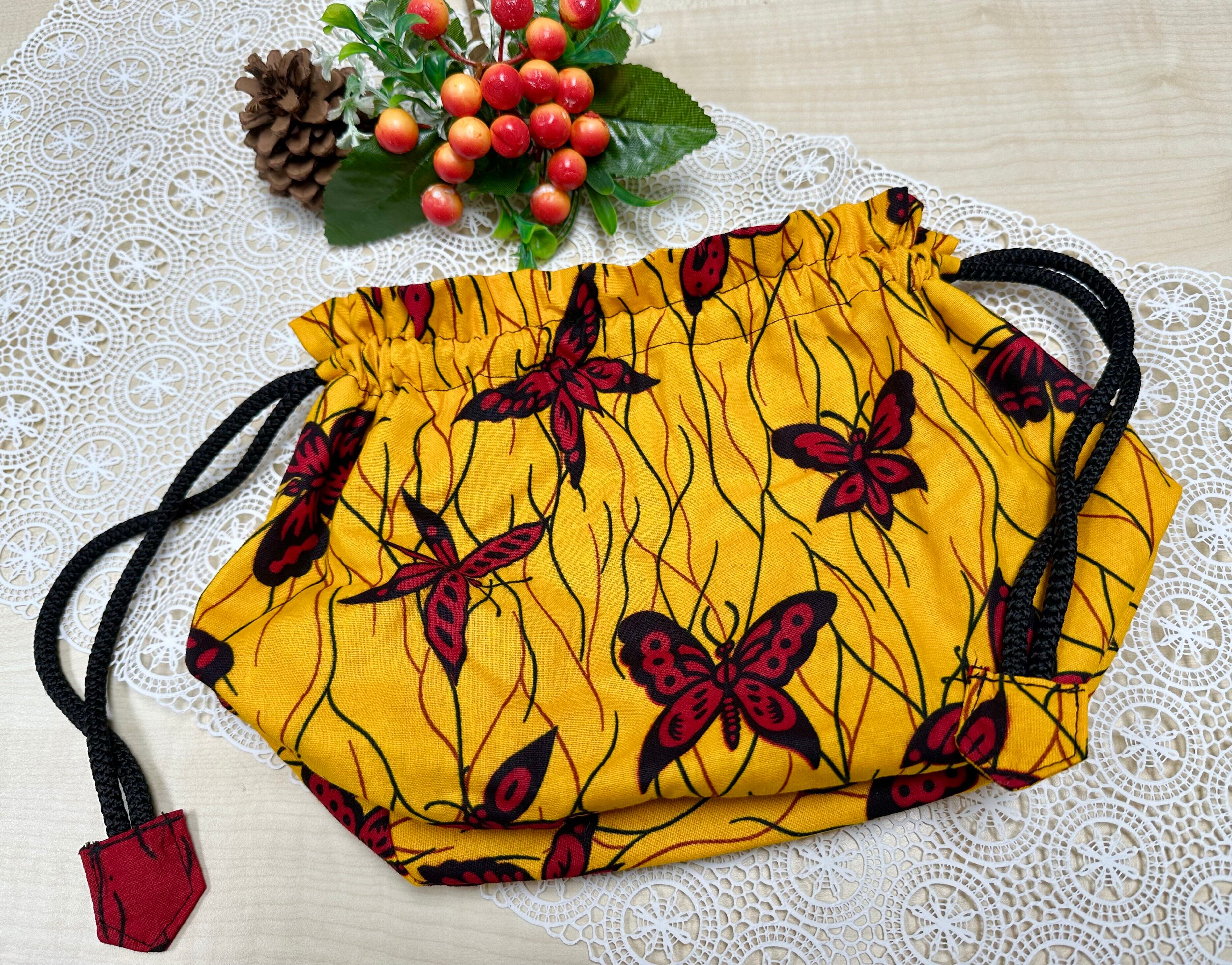ジャパニーズテイストの巾着袋をアフリカンバティックで作りました。和の雰囲気を損なわず、アフリカンバティックの柄がスタイリッシュさに磨きをかけます。